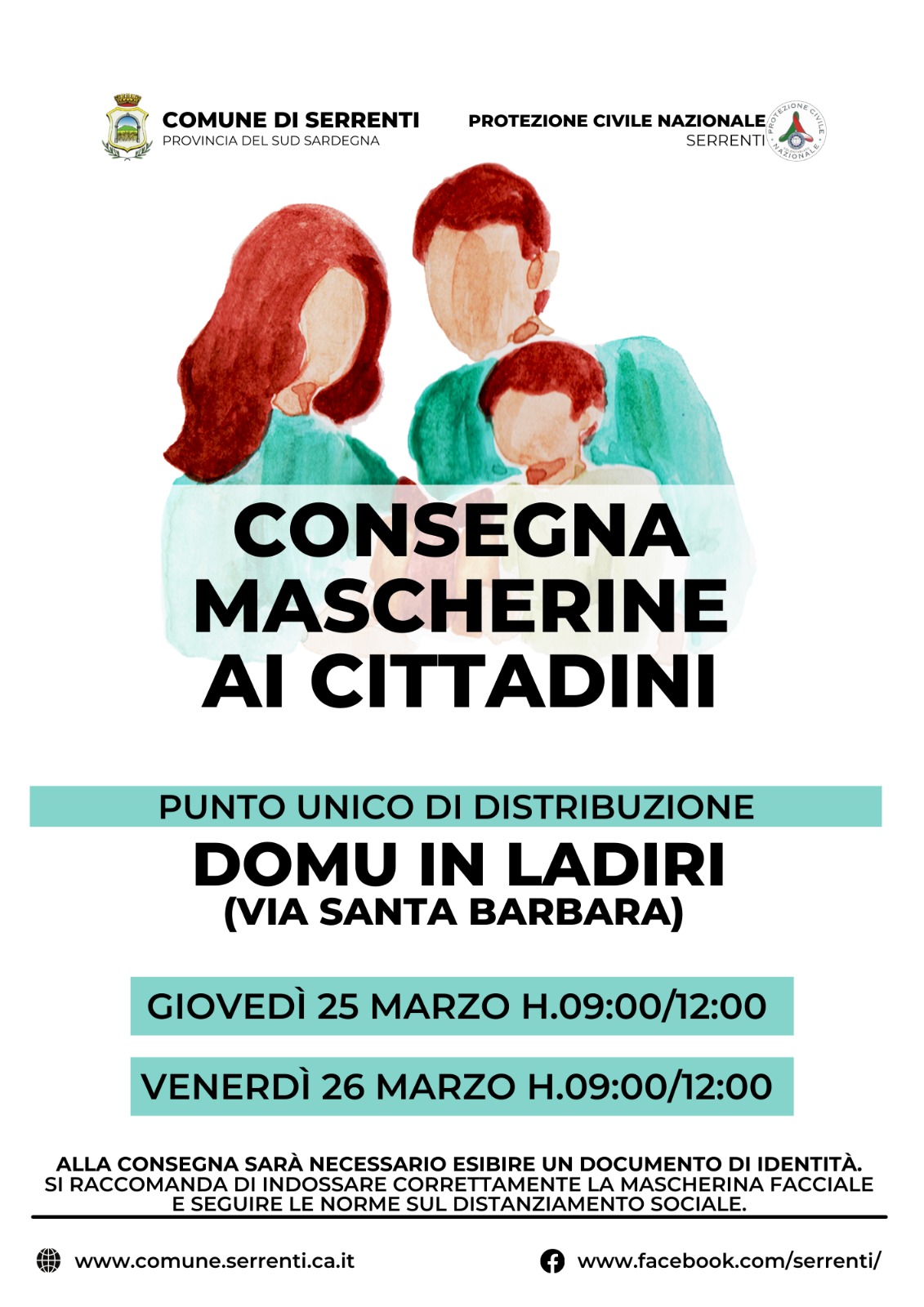 Si informa la popolazione che, per i cittadini che non avessero ancora ritirato le mascherine, ci sarà un'ulteriore consegna ai cittadini, presso Sa Domu in Ladiri in via Santa Barbara, nelle seguenti giornate e orari: