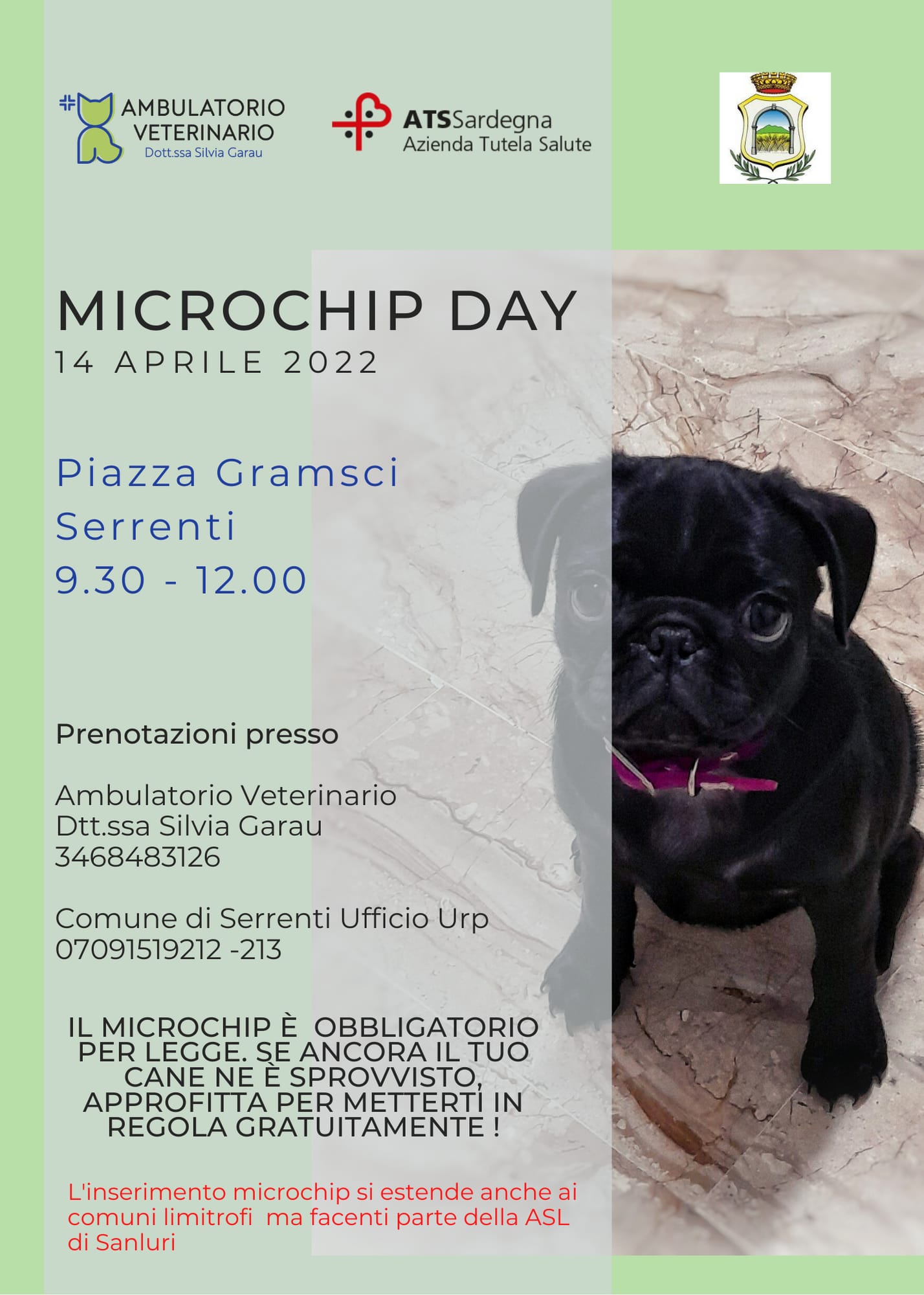 Si informano i cittadini interessati che il giorno 14 aprile 2022 dalle ore 9.30 alle 12.00 si svolgerà a Serrenti in Piazza Gramsci il MICROCHIP DAY.